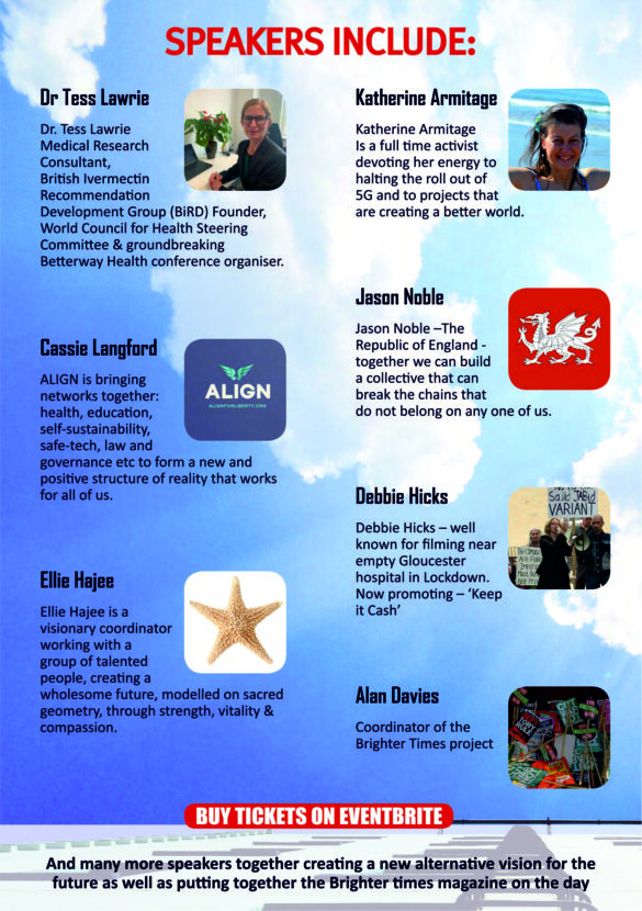 BRIGHTER TIMES MAGAZINE CONFERENCE – SUNDAY 31ST JULY 2022 10am – 7pm Tickets £15 https://www.eventbrite.co.uk/e/brighter-times-magazine-alternative-world-festival-tickets-382888930097 Venue: E57 Social Club, 699 Alcester Rd South, Birmingham B14 5EY 1.00 -2.00pm LUNCH…