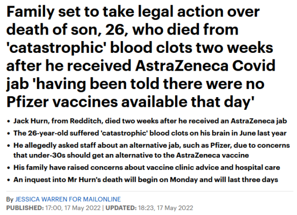 The heartbroken family of a 26-year-old graduate who died from ‘catastrophic’ blood clots on his brain two weeks after he received an AstraZeneca vaccine are set to take legal action…